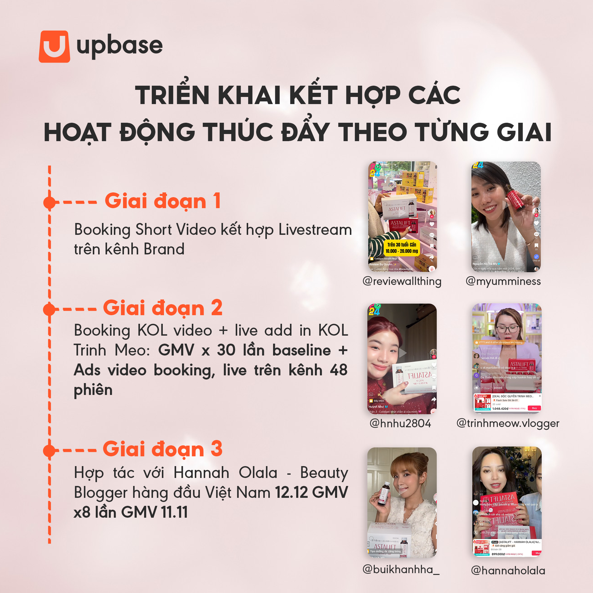 Cũng trong giai đoạn này, UpBase đã triển khai đến 48 buổi livestream trên kênh Astalift, live KOC và live với 2 KOLs là Trinh Meow (GMV 125tr/4 buổi) và An Phương (GMV 25tr/buổi)