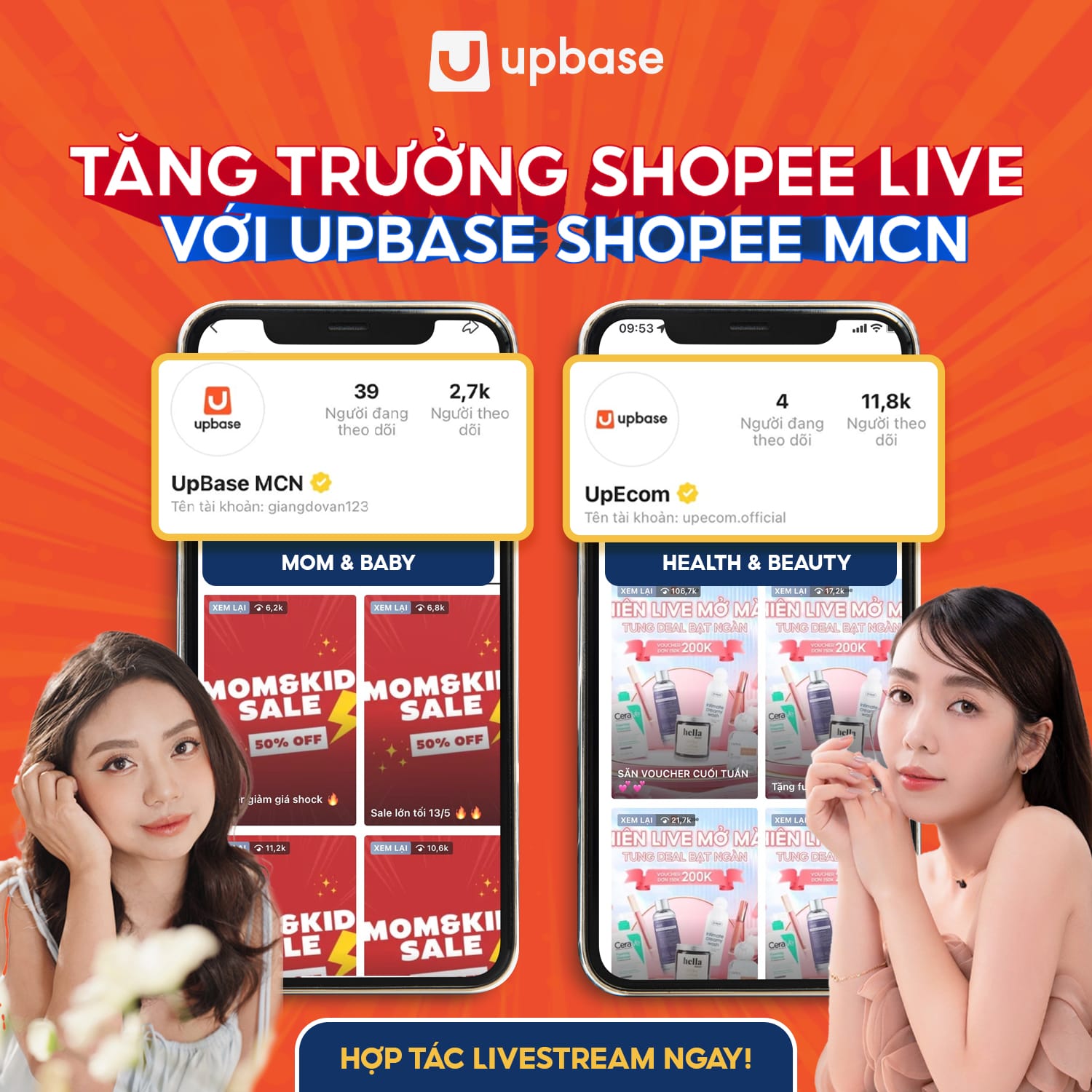 Qua hai kênh này, UpBase sẽ kết nối brands với KOLs/KOCs thực hiện các phiên Livestream daily, Key Live. Triển khai giải pháp Livestream & Short Video dựa trên kinh nghiệm thực chiến và mạng lưới KOLs/KOCs.
