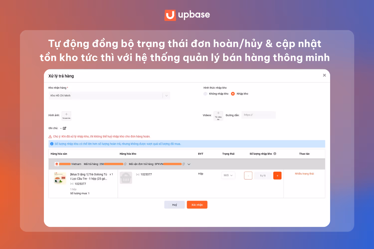 - Tự động đồng bộ dữ liệu tồn kho realtime sang kế toán của các đơn hoàn/hủy để loại bỏ sai lệch thông qua phần mềm quản lý bán hàng như UpS.