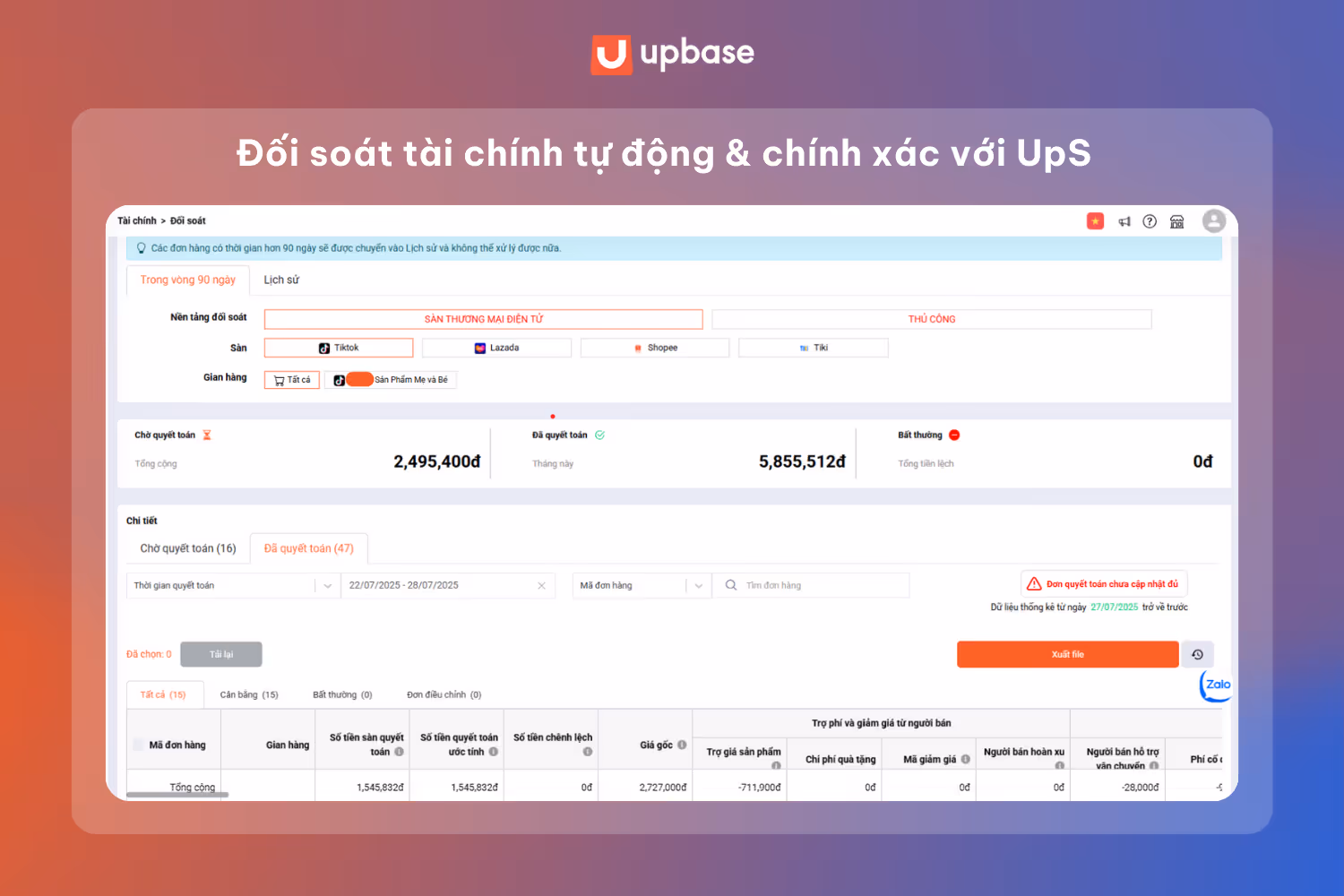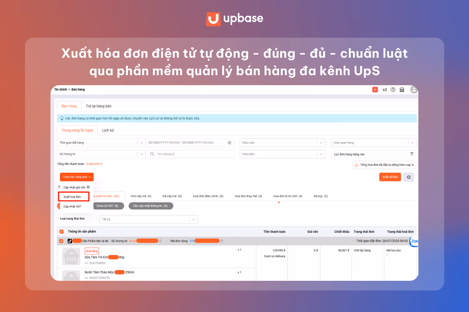 Ứng dụng phần mềm UpS giúp xuất hóa đơn điện tử tự động cho tất cả các đơn hàng, đảm bảo đúng chuẩn – đúng hạn - đúng thông tin, đồng thời, tự động đối soát dữ liệu giữa sàn - hóa đơn và cảnh báo chênh lệch.