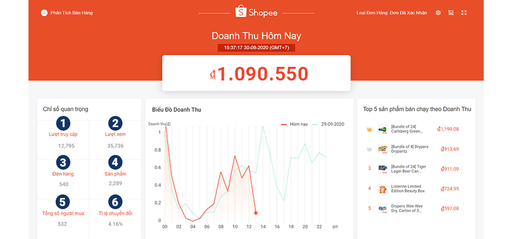 Mẹo: So sánh xu hướng của ngày hôm nay và các ngày trước đó để dự đoán khối lượng hàng bán ra ở các khung thời gian cụ thể. Từ đó, bạn có thể tận dụng khung giờ cao điểm bằng cách tăng quảng cáo sản phẩm với khuyến mãi, mã giảm giá và các công cụ khác tại Kênh Marketing.