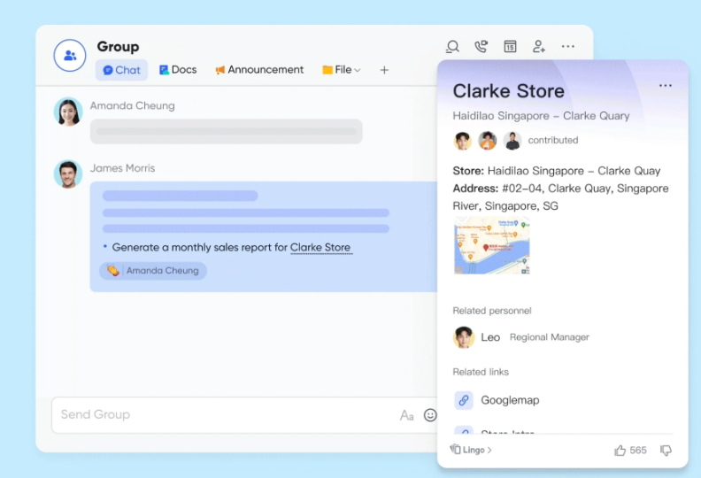 In daily conversations with other staff members and managers on Lark, store employees are also able to click on keywords in text messages to access store information, recipe standards, and operational protocols. By using Lark Lingo, the frontline team can easily locate the operational knowledge they need.