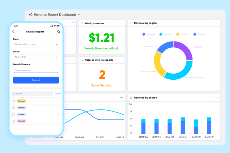 Store managers can easily submit revenue reports and receive automated reminders as deadlines approach. Dashboards will be refreshed automatically based on the numbers. Additionally, the finance department provides varying permissions in Lark Base for store and regional managers to view dedicated sales calibrations and forecasts without the need to create multiple charts.
