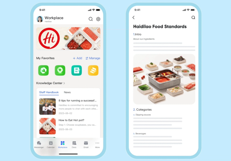 To begin unifying the quality of service, the first task is to ensure that every staff member is referring to the same set of requirements. At Haidilao, store teams can use Lark Workplace to access the same, up-to-date guidelines, standards, company policies, and other necessary materials from a single location on their mobile devices.