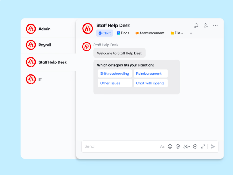 To ensure that every staff member sees and acknowledges important updates, Haidilao shares them through Lark Announcement to accurately pushes the updates to relevant employees. Additionally, the company improves employee service responsiveness by automating more than 70% of Q&A via Lark Help Desk, which helps the admin team save over 60,000 hours every year.