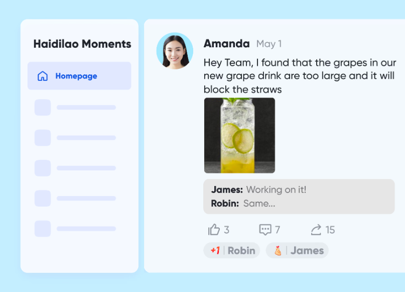 A dedicated operations team is in place to follow up on feedback and implement suggested changes. Moments also serve as virtual offices for frontline teams, enabling them to share memorable highlights and stories about life at Haidilao, even if they do not work in the same store.