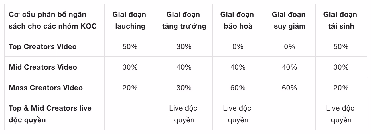- Chuyển dịch chiến lược hợp tác với KOL/KOC bằng KOC key cho video và Livestream affiliate độc quyền. Dưới đây là tỉ trọng gợi ý từ UpBase: