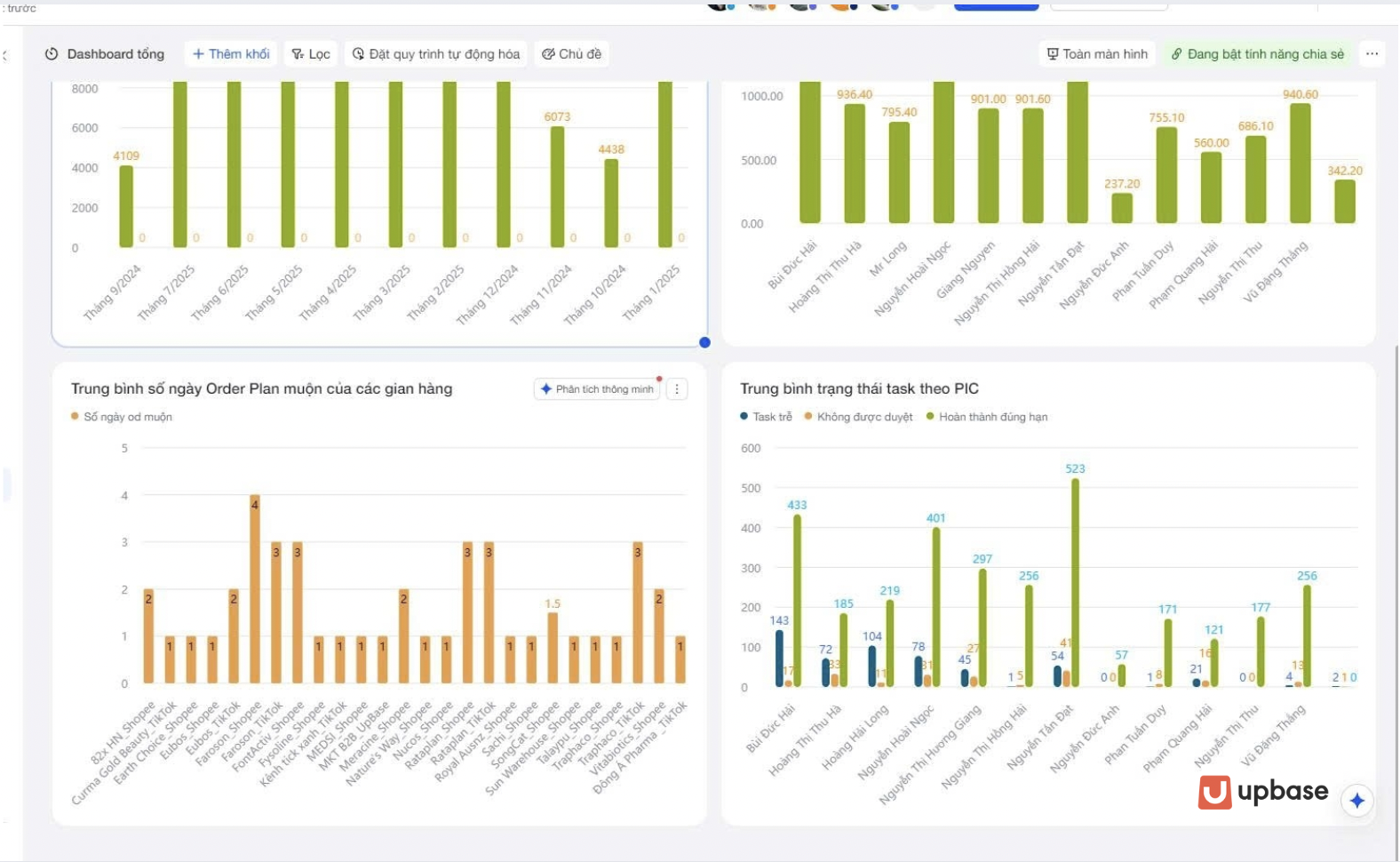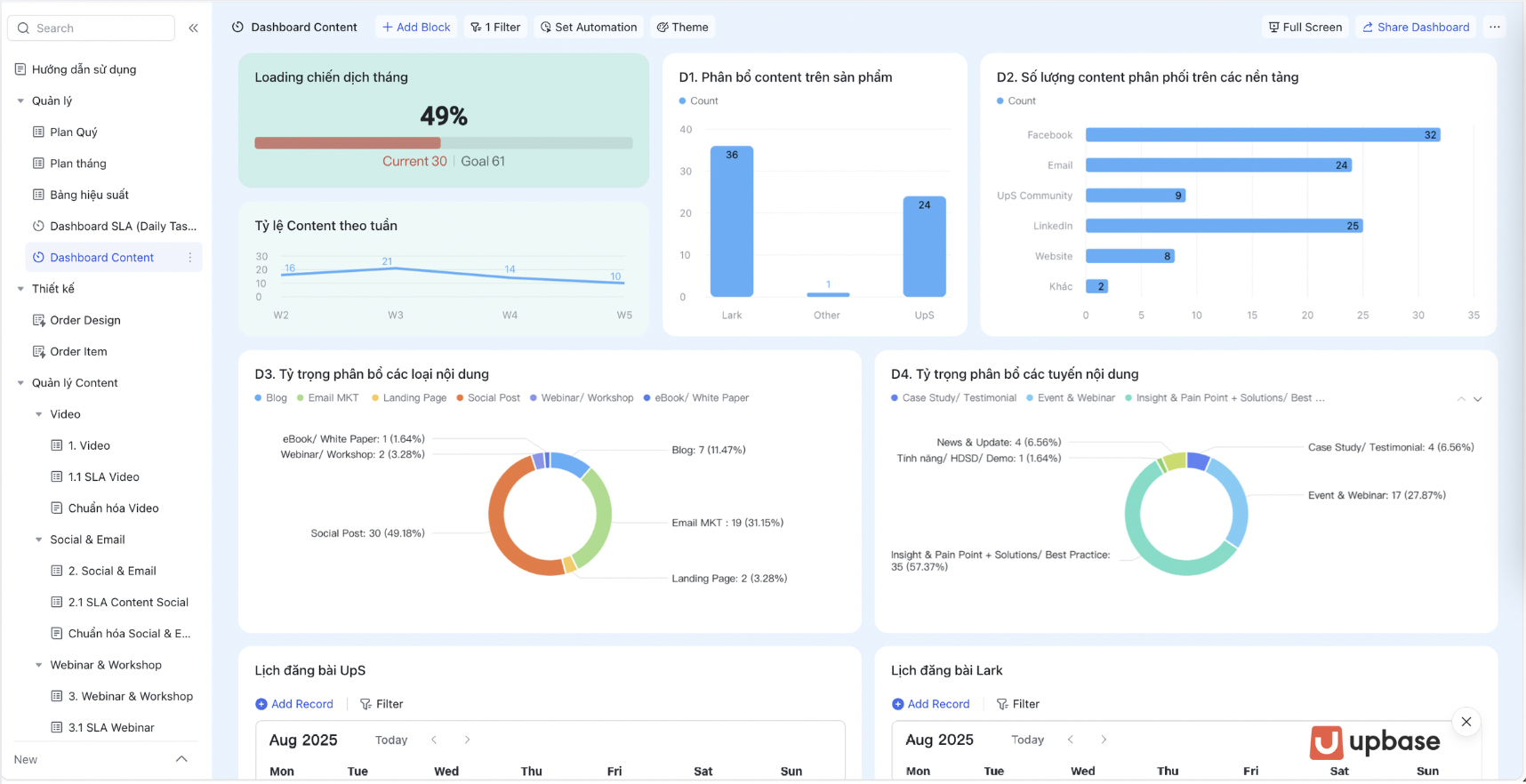 Mọi dữ liệu từ plan Content, order Design, tiến độ SLA, phê duyệt… được tự động tổng hợp lên Dashboard.