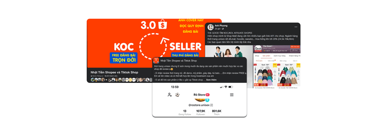 Các cộng đồng như Nhặt Tiền Shopee, UpBase MCN – Cộng đồng Booking KOC/Livestreamer TikTok Shop, Nhặt Tiền Affiliate Tiktok Shop – Shoppe Việt Nam,… đều là các cộng đồng kết nối uy tín. Tại đây Brand có thể đăng post tìm KOC phù hợp cho chiến dịch của mình. Cũng có thể thấy được các post KOC đăng tìm job booking và lựa chọn cho mình. Đối với hình thức này, yêu cầu Brand dành thời gian tìm kiếm, cũng như chọn lọc nhiều.