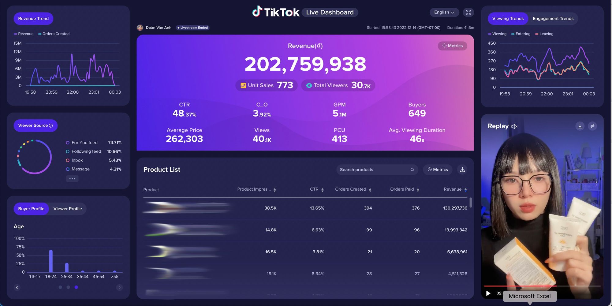 Tổng sản phẩm bán ra trong phiên: 773 sản phẩm với 40,1K lượt xem live. Mang về doanh thu 202.759.938 triệu đồng