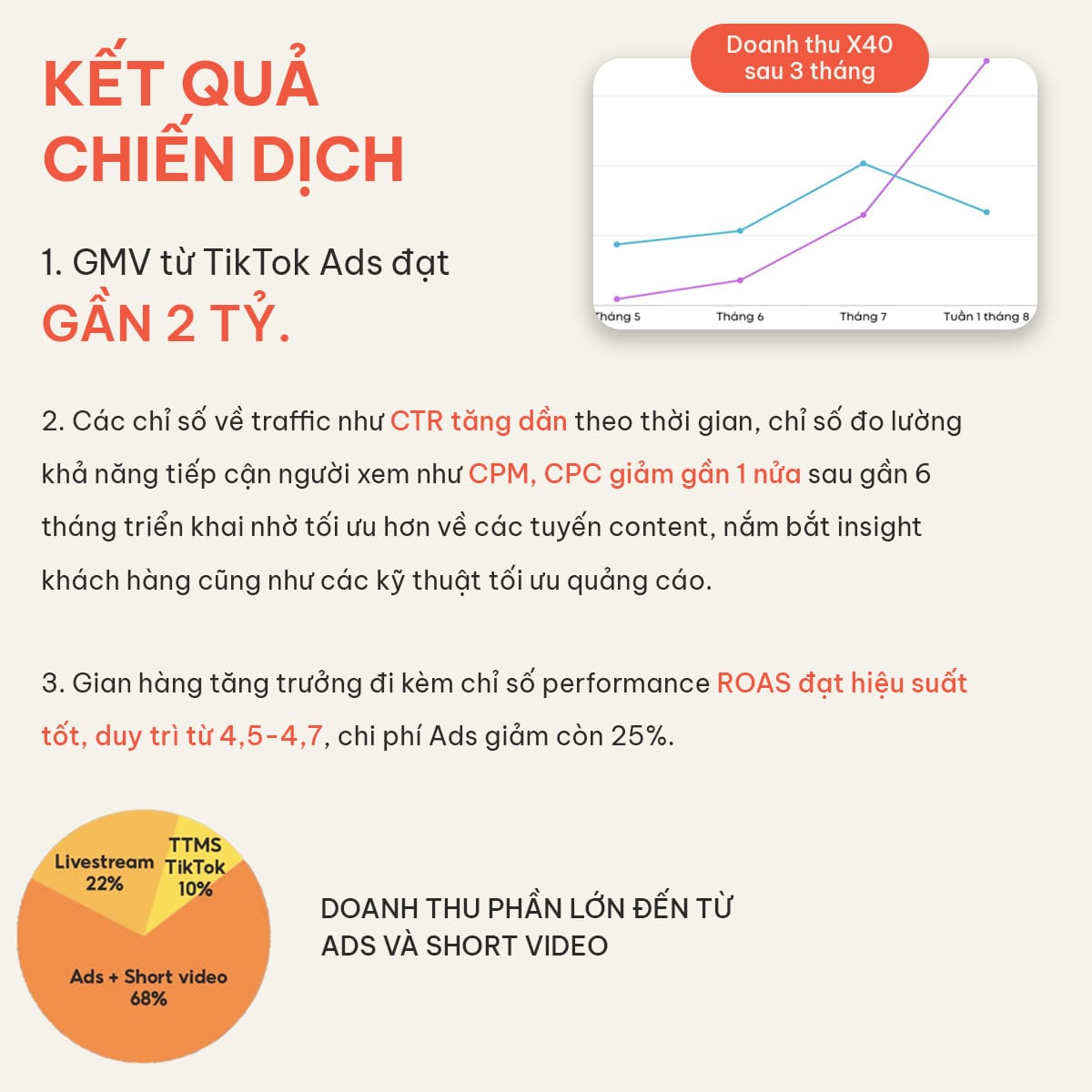 Các chỉ số về traffic như CTR tăng dần theo thời gian, chỉ số đo lường khả năng tiếp cận người xem như CPM, CPC giảm gần 1 nửa sau gần 6 tháng triển khai nhờ tối ưu hơn về các tuyến content, nắm bắt insight khách hàng cũng như các kĩ thuật tối ưu quảng cáo.