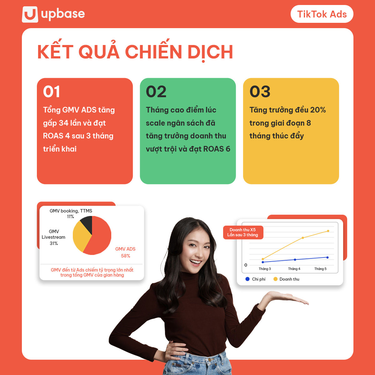 UpBase đã chiến lược chạy quảng cáo chuyển đổi để tăng doanh số sản phẩm trên TikTok Shop từ tháng 3/2023 đến nay. Tệp khách hàng được nhắm chọn vào ngày thường là nữ 70%, nam 30%. Còn ở ngày lễ, tệp khách hàng nam sẽ chiếm 70%, nữ 30%.