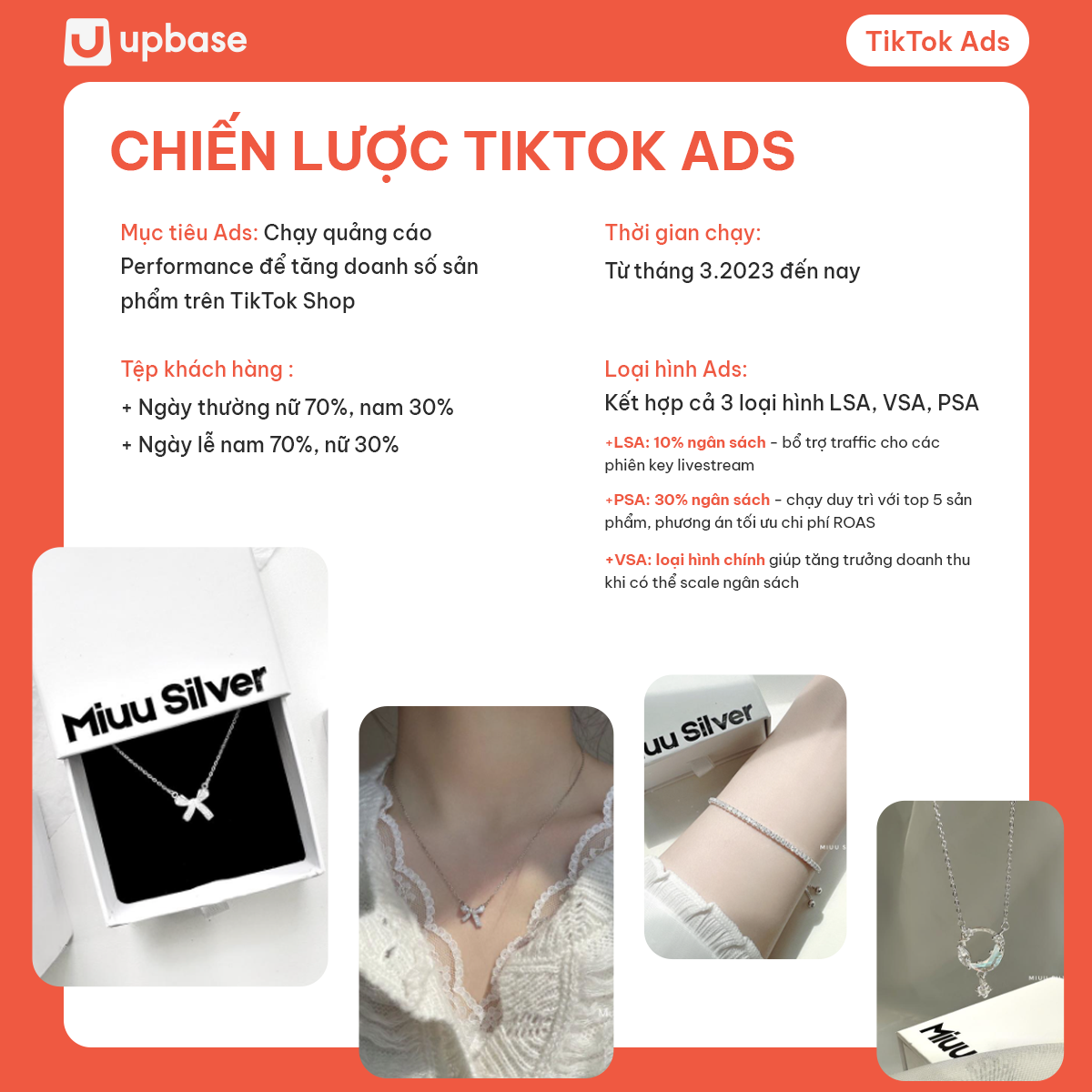 Nhận thấy tiềm năng to lớn của TikTok, Miu Silver đã hợp tác với UpBase để vận hành và thúc đẩy gian hàng TikTok Shop của nhãn hàng. Và chiến lược TikTok Ads thông minh đã góp phần lớn trong việc đưa gian hàng này tăng trưởng doanh thu gấp 11 lần!